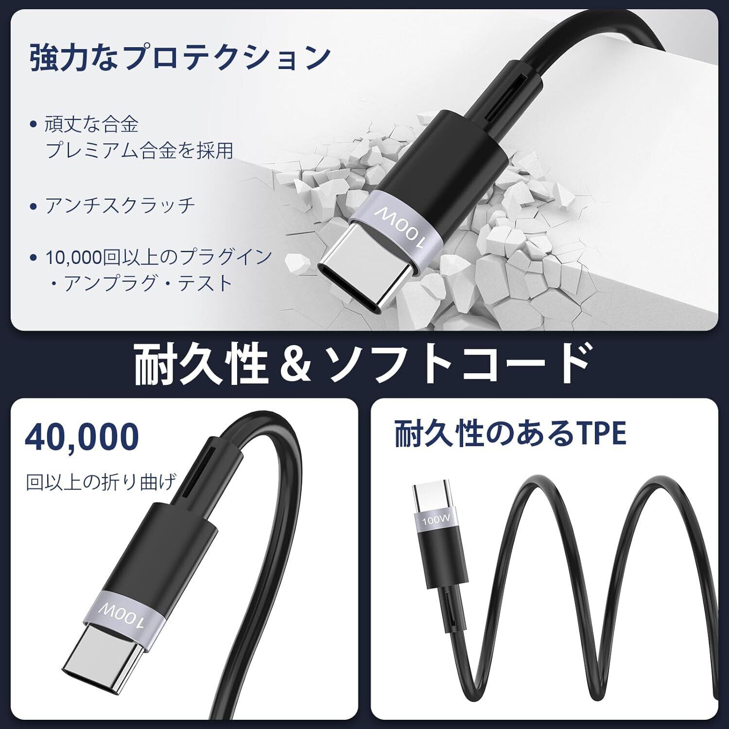 このタイプc ケーブルは最新の2023 E-Markチップを採用し、デュアルインテリジェントチップを内蔵しているため、100Wの高速急速充電に対応し、MacBook Proを30分で55%まで充電できるだけでなく、安全で安定した充電にも対応し、過電流、過電圧、過電流を効果的に防止し、お使いのデバイスを保護します。